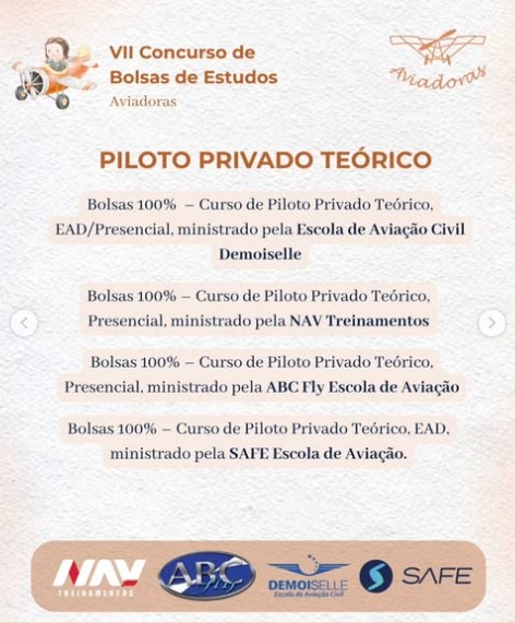 O VII Concurso de Bolsas de Estudos Aviadoras reúne oportunidades doadas por escolas, instrutores, plataformas e centros de treinamento. Além disso, cursos teóricos, práticos e técnicos estarão disponíveis em áreas essenciais da aviação brasileira. As principais categorias são apresentadas a seguir.