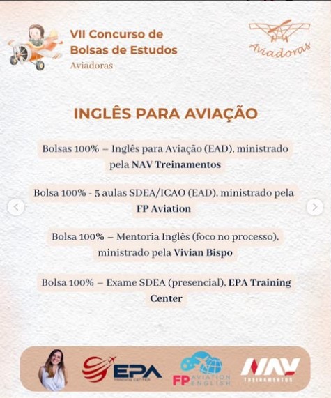 As bolsas incluem Inglês para Aviação (EAD) pela NAV Treinamentos, aulas SDEA/ICAO pela FP Aviation, mentoria da Vivian Bispo e exame SDEA presencial pelo EPA Training Center. Além disso, esses conteúdos fortalecem competências essenciais para a aviação internacional.
