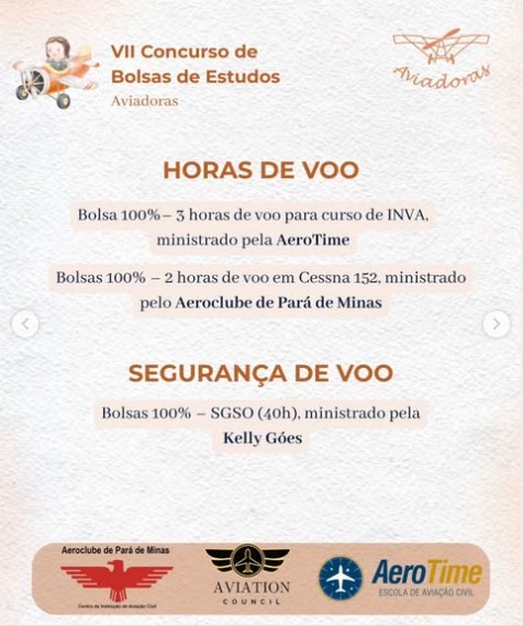 O AeroTime oferece três horas de voo destinadas ao curso de Instrutor de Voo de Avião (INVA). Além disso, o Aeroclube de Pará de Minas concede duas horas de voo em Cessna 152. Dessa forma, as oportunidades ampliam a experiência prática das futuras aviadoras.