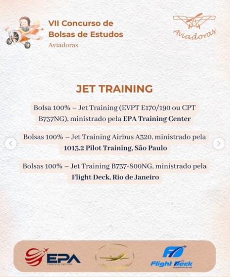 As bolsas incluem Jet Training – treinamento avançado em simulador que prepara pilotos para operar jatos comerciais e ingressar em companhias aéreas -, no EPA Training Center (EVPT E170/190 ou CPT B737NG), treinamento A320 na 1013.2 Pilot Training e treinamento B737-800NG na Flight Deck. Além disso, essas formações são importantes para quem busca ingressar ou avançar na aviação comercial.